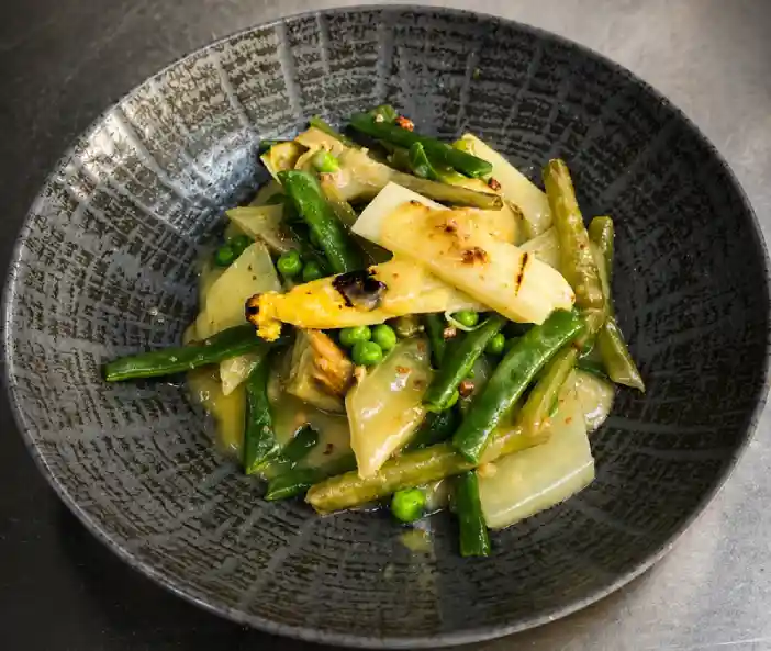 - Del huerto a la brasa: Espárragos de la huerta navarra y hongo boletus a la brasa sobre crema fría de espárrago y mantequilla … 17€